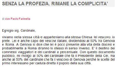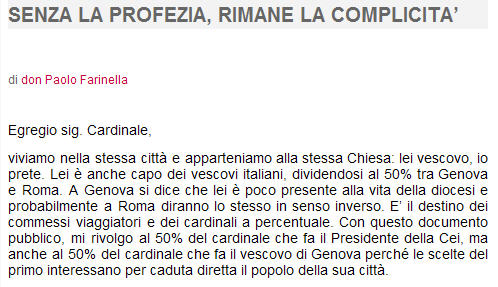 Un prêtre (*) italien a donc écrit une lettre ouverte au cardinal de Gênes et président de la CEI, grand ami du Pape, à ce qu'il me semble.