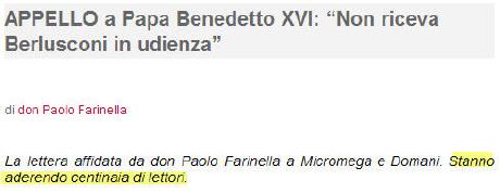 Pharisien d'aujourd'hui, il vient d'en écrire une autre (car le cardinal Bagnasco n'était manifestement que du menu fretin pour lui), carrément au Saint-Père, cette fois, pour le supplier de ne pas recevoir Berlusconi en audience.