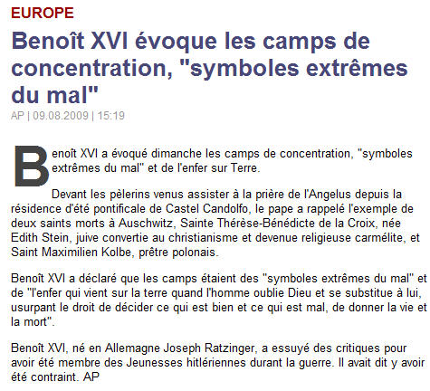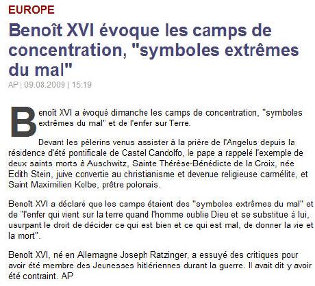 Le pape Benoît XVI a comparé dimanche les camps d'extermination nazis à des "symboles de l'enfer sur la terre", au cours de la prière de l'Angélus à Castel Gandolfo, la résidence estivale des papes dans les environs de Rome.