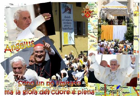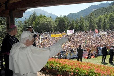 Ambience de fête et temps superbe (sous un ciel d'un bleu profond) ce dimanche 26 juillet, sur le pré devant le chalet, où l'évêque d'Aoste Mgr Anfossi a célébré la messe avant d'accueillir le Saint-Père venu saluer les nombreux pélerins enthousiastes (au premier rang, banderoles "we love our pope", "al nostro amatissimo Benedetto", choeurs "Be-nedetto..."etc.) et réciter la prière de l'Angelus.