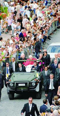 C'est ainsi que Benoît XVI a voulu prendre congé de ceux - et il s'agissait de quelques centaines de personnes - qui ont érigé autour de lui durant ces deux semaines un réseau de protection humaine pratiquement invisibile, si l'on considére sa consistance et l'aire relativement réduite sur laquelle elle était déployée. Police, protection Civile, pompiers, les hommes de l'Inspectorat de Police près du Vatican, ceux de la Gendarmerie et des Services Sanitaires du Vatican. Tous unis dans cette accolade "idéale" du Pape :