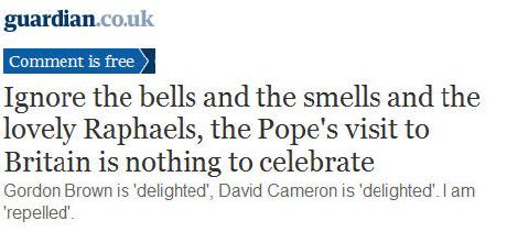 Hier, traduisant une des lettres de "pseudo Berlicche" à son neveu Malacoda, je suis tombée sur un article du Guardian, journal pudiquement qualifié de "centre gauche", en tout cas très lu outre-Manche, souhaitant à sa façon la "bienvenue" au Saint-Père, dont le voyage en Angleterre est annoncé pour l'an prochain.