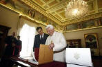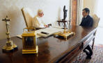 En échange, le pape lui a remis un stylo en bois sculpté -un modèle réduit d'une des colonnes du baldaquin du Bernin dans la basilique de Saint-Pierre- pour, lui a-t-il dit en français devant la presse, "signer ses documents". "Des documents qui vous agréent", lui a répondu François Fillon.