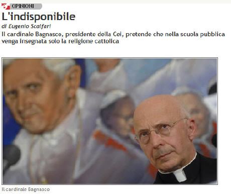 - D'abord, l'épisode de l'heure d'Islam à l'école, je renvoie mes lecteurs à un article, qui donne une idée de la polémique consécutive: Italie: l'heure d'Islam à l'école. Le cardinal Bagnasco, comme c'était son rôle, et comme il en a de toutes façons le droit, s'est exprimé à travers un article publié dans Il Corriere della sera: