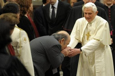 L'homme que le Saint-Père salue ainsi est Lino Baffi, populaire acteur italien, qui assistait à la veillée du pape avec les familles, en juillet 2006, à Valence. (http://www.benoit-et-moi.fr/archivesbeatriceweb/Valence/...)