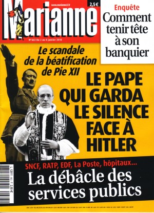 Je lis dans ce qu'il est convenu d'appeler la blogosphère catholique des éloges vibrants à "Marianne" qui aurait, paraît-il, manifesté une fois de plus sa "liberté de ton", son "indépendance", son "anticonformisme" en "titrant" "Pie XII : et si Marianne se trompait?"