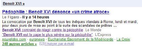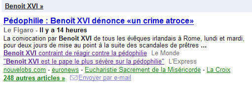 Capture d'écran (mercredi des Cendres, 10h) de la page d'actualités de Google, rubrique "Benoît XVI" (définie par moi)