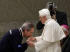 Au terme de l'audience, le Saint-Père, aidé de son secrétaire, a endossé pendant un bref instant le gilet bleu avec l'écusson de la protection civile (et on ne peut qu'être réjoui de le voir si serein et si chaleureux: décidément, cet homme extraordinaire dément tous les clichés!!).