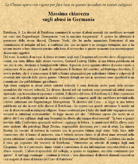 Sur le site, on lit encore: "Nous avons su que même un ancien de la chorale (au début des années soixante) a rapporté à la presse des abus sexuels... Conformément aux dispositions de la Conférence épiscopale allemande - ajoute la lettre - les aveux de l'ex-élève ont été transmis à la psychologue Birgit Boehm, responsable diocèsaine pour les cas d'abus. Mme Boehm a essayé de contacter la victime présumée des abus. Toutefois, sur la base de ce que nous connaissons pour le moment, il n'est pas encore clair si les abus se sont produits dans notre institution ou dans l'école primaire Etterzhausen (actuel Pielenhofen). La lettre cite également le cas déjà rapporté par l'évêque de Ratisbonne: "Par un article de journal des années cinquante, qui nous est parvenu, nous avons eu connaissance d'une information concrète relative à un abus sexuel. le responsable du collège de cette époque pour ce que nous savons, a été condamné pour cela".