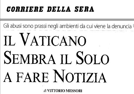 Ce ne sont que de petites notes marginales qui s'ajoutent à ce qu'a dit l'autre jour le porte-parole du Vatican, le Père Federico Lombardi: " Certes, ce qui est pratiqué dans certains milieux religieux est particulièrement regrettable, compte tenu de la responsabilité morale et éducative de l'Eglise. Mais ceux qui sont objectifs et informés savent que la question est beaucoup plus large et concentrer uniquement les accusations contre l'Eglise fausse la perspective".