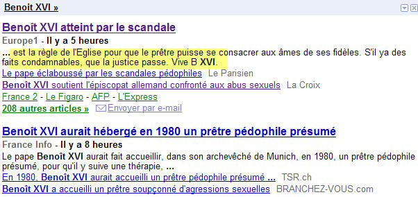 Sans rentrer dans le détail des titres honteux de la grosse presse, je ne peux m'empêcher de voir un signe dans le premier qui me tombe sous les yeux, sur la page d'actualités de Google. Venant d'Europe 1, on s'attend à l'habituel tombereau d'ordures. Eh bien non! Par la magie du robot qui indexe les articles, on est renvoyé à un lien, où l'on peut lire, avec autant de stupéfaction que de soulagement, sous le titre prévisible "Benoît XVI atteint par le scandale", ce formidable cri du coeur d'un internaute de passage sur le site: