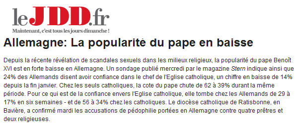 Peut-on imaginer plus idiot que cette dépêche d'agence? Décidément, les medias ne comprennent rien, et, ce qui est plus grave, ils trompent leurs lecteurs, en leur livrant des "informations" sans queue ni tête! (24/3/2010)