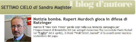 En Italie aussi, le canal de Murdoch se distingue dans la défense du Pape Benoît XVI. Non pas parce que les informations de sa chaîne, Sky, en font l'apologie, mais simplement parce qu'ils fournissent une information plus riche, plus documentée et objective que ses rivaux. Stefano Maria Paci est leur vaticaniste vedette (à suivre).