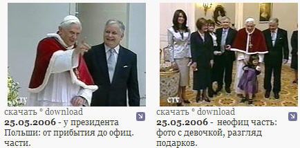 Grâce au merveilleux site russe http://benedictxvi.tv/ , et aux patientes recherches de Sheelagh, nous revoyons avec émotion les images de "la visite de courtoisie" de Benoît XVI au président polonais, le 25 mai 2006.