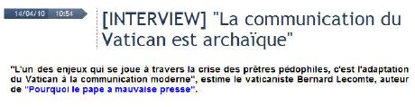 Bernard Lecomte, qui court en ce moment les studios de radios, les plateaux de télé, et ainsi de suite, pour rappeler au bon souvenir du public un livre dont les ventes étaient peut-être en train de faiblir, "Pourquoi le Pape a mauvaise presse", et qui s'est autoproclamé "soutien du Pape" auprès des medias, écrit dans le Nouvel Observateur en ligne: