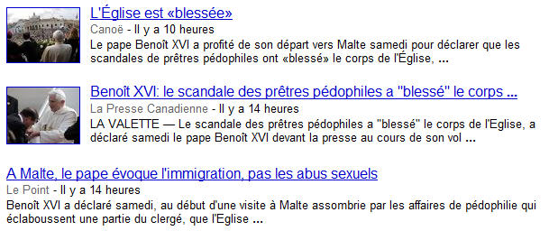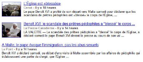 Les premiers compte-rendus en français ont mis l'accent sur l'immigration, un sujet pas déplacé puisque, dit le Saint-Père "Malte est l'endroit où les courants de réfugiés arrivent d'Afrique, et frappent à la porte de l'Europe" (mais les medias n'ont cité qu'une partie de son propos), et surtout les "scandales pédophiles", comme en témoigne cette capture d'écran sur la page d'actualité de Google: