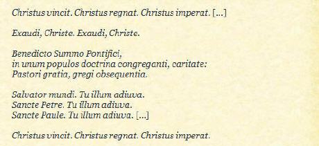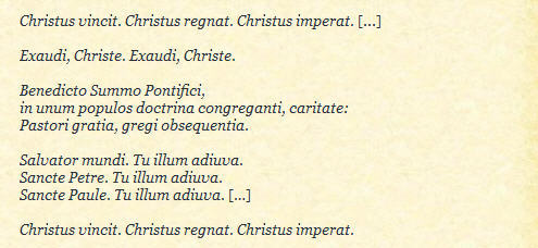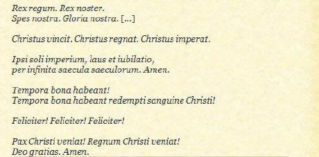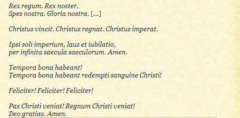 répond à sa façon aux attaques contre l'Eglise: Christus vincit. Christus regnat. Christus imperat. Exaudi, Christe. Exaudi, Christe. Benedicto Summo Pontifici...
