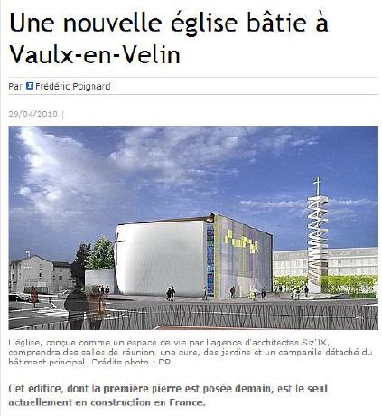 Chantier unique actuellement en France, une église catholique doit voir le jour d'ici 2012 à Vaulx-en-Velin, banlieue de Lyon où se sont installées 250 familles chrétiennes d'Irak.