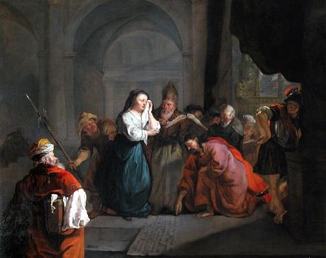 Alors qu'il enseigne dans le Temple, les scribes et les pharisiens conduisent à Jésus une femme surprise en adultère, pour lequel la loi mosaïque prévoyait la lapidation. Ces hommes demandent à Jésus de juger la pécheresse, afin de «la mettre à l'épreuve» et de la forcer à faire un faux pas. La scène est chargée d'un caractère dramatique: des paroles de Jésus dépendent la vie de cette personne, mais aussi sa propre vie. Les hypocrites accusateurs, en effet, font semblant de lui confier le jugement, alors qu'en fait c'est lui, justement, qu'ils veulent accuser et juger. Au lieu de cela, Jésus est «plein de grâce et de vérité» (Jean 1,14). Il sait ce qu'il y a dans le cœur de chaque homme, il veut condamner le péché, mais sauver le pécheur, et démasquer l'hypocrisie.