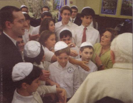 Mais l’article d’Andrea Tornielli lorsqu’il évoque les précédentes visites de Benoît XVI dans des synagogues me fait aussi et surtout pensé à la photo où l’on voyait le Saint Père entouré de jeunes enfants juifs new-yorkais dont les garçons coiffés de la kippa. Le Saint Père avait dit son émotion « à penser que Jésus enfant écoutait l’Écriture dans un lieu semblable ». C’est pour moi le plus beau et le plus complet des symboles des rapports judéo-chrétiens.