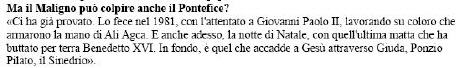 - Il a déjà essayé. Il l'a fait en 1983, avec l'attentat contre Jean-Paul II, travaillant sur ceux qui ont armé la main d'Ali Agça. Et encore cette fois, la nuit de Noël, avec cette folle qui a jeté à terre Benoît XVI (ndt: Carlota avait à l'époque parlé à juste titre de profanation). Au fond, c'est ce qui arrive à Jésus à travers Judas, Ponce-Pilate, le Sanhédrin...