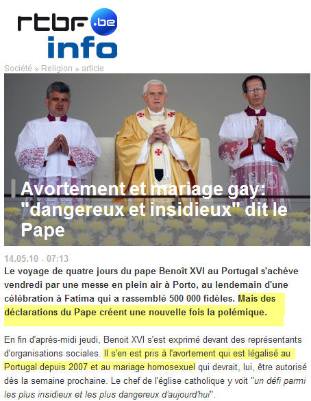 Ce n'est pas moi qui le dit, ce sont les titres des medias (principalement radiophoniques) après le discours du Pape, hier, lors de la rencontre avec les organisateurs de la pastorale sociale. Pour occulter le triomphe de Fatima.... (14/5/2010)