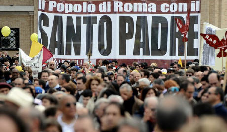 Le peuple du "Papa day" (ndt: allusion au family day, qui, il y a tout juste trois ans avait rassemblé un million de personnes dans les rues de Rome en défense de la famille fondée sur le mariage entre un homme et une femme) - ainsi que l'a baptisé l'imaginatif bureau de presse de la Coldiretti - a commencé à remplir l'espace autour de la colonnade du Bernin dès 8h, dimanche matin. Banderoles, ballons, casquettes, et volonté tranquille de témoigner son affection au Pape. De nombreux amis qu'on n'a pas vus depuis des années, de Milan, Turin, Biella, derrière nous, il ya même une bannière "CL (communion et libération) Deutschland". Quelques nouveaux amis comme ceux de l'Aquila.