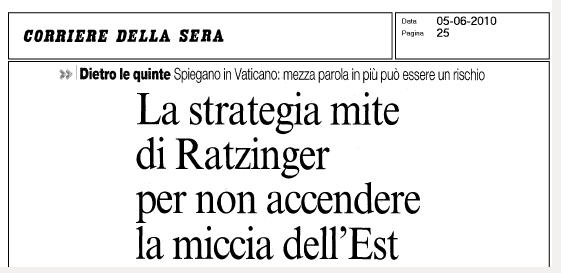 Derrière les propos du Pape sur le meurtre de Mgr Padovese: la stratégie de douceur de Ratzinger pour ne pas mettre le feu aux poudres, en Orient (Corriere della Sera. 5/6/2010)