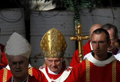 Dans la procession d’entrée, les quatre cardinaux Bertone, Foley, Sandri et Kasper précédaient le pape, suivis du P. Pierbattista Pizzaballa, o.f.m., custode de Terre Sainte, de Mgr Antonio Franco, nonce en Israël et à Chypre et délégué apostolique en Palestine, de l’archevêque maronite de Chypre Joseph Soueif et du Patriarche latin Fouad Twal.
