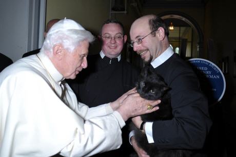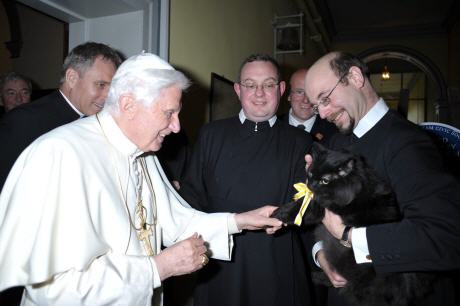 A propos d'animaux, Raffaella a eu l'autorisation de reproduire en grand format deux photos exclusives de l'OR, où l'on voit le saint-Père, en visite à l’Oratoire saint Philippe Neri de Birmingham, caressant un gros chat noir (gatto soriano, un chat syrien, d'après ce que j'ai compris) , ayant un cou un beau ruban aux couleurs du Vatican.