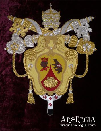 Ce blason, brodé entièrement à la main, a été conçu dans les Ateliers d'ornements liturgiques Ferrarais Regia Ars; il re-propose le blason, avec les emblèmes du Pape et le pallium orné de croix rouges. La partie extérieure est au contraire inspirée par les armoiries du pape Barberini (Urbain VIII, pape de 1623 à 1644) que l'on voit sur les piliers du Baldaquin du Bernin dans la basilique Saint-Pierre.