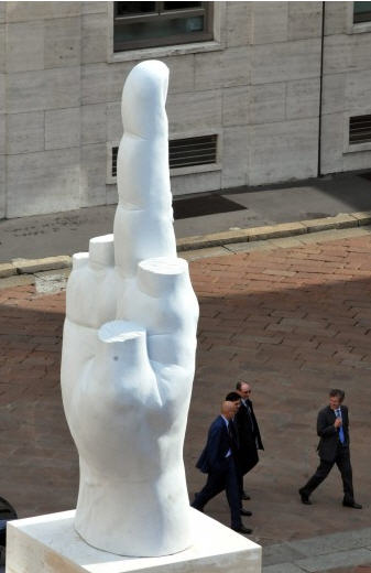 Il me semble déjà l'entendre, l'amie, habituée des galeries d'art, celle qui ne manque jamais une «installation» et va en pèlerinage au Guggenheim de Bilbao au moins une fois par an: "Tu vois que j'avais raison de dire que ta vision est rétrograde? le doigt de Cattelan sur la Place de la Bourse de Milan restera là jusqu'à la mi-Octobre, et peut-être pour toujours. Un succès incroyable".