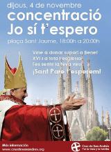 Et tandis que les syndicats préparent à Barcelone une grève des autobus pour protester contre sa visite, sans oublier les embrassades à pleine bouche des paires d’homosexuels et autres inventions pavloviennes du même acabit, prévues sur le chemin du passage du Saint Père (1) , des associations très efficaces et sympathiques s’activent comme celle de la Croix de Saint André, comme le montre sa belle affiche (Organisation d’un rassemblement le 4 novembre pour montrer que le Pape est attendu à Barcelone).