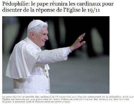 « “Italie : les cardinaux vont réfléchir à une réponse de l’Église aux affaires d’abus sexuels” (New York Times), “Le pape convoque les cardinaux sur les abus sexuels” (AFP), “Les cardinaux vont traiter des abus sexuels” (UPI), “Le pape convoque les cardinaux pour discuter des scandales sexuels et d’autres problèmes” (Canadian Press), “Les prélats vont discuter de la manière de répondre au scandale des abus sexuels” (Business Week), “Le pape va tenir un sommet sur les abus sexuels” (Wall Sreet Journal), “Le pape convoque une réunion des cardinaux sur les abus sexuels” (Washington Post), “Le pape convoque les cardinaux à Rome pour un sommet sur les abus sexuels” (Belfast Telegraph), “Le pape convoque les cardinaux pour une réunion sur les abus sexuels” (CathNews India), “Le pape convoque les cardinaux pour des discussions sur les abus [sexuels]” (Daily Nation). On pourrait poursuivre la liste, mais vous avez compris. L’une après l’autre, les manchettes des principaux journaux du monde, ont annoncé que le pape Benoît XVI avait convoqué les cardinaux à Rome pour parler des abus sexuels. Mais il ne s’agit pas de cela. Oui, le pape a convoqué les cardinaux à Rome. Et oui, le scandale des abus sexuels figure au programme. Mais il n’est pas en tête du programme ni en deuxième place. Il y a cinq thème qui sont au programme des discussions du consistoire du 19 novembre : deux sujets majeurs et trois sujets de moindre importance. La scandale des abus sexuels fait partie des sujets de moindre importance. Toutefois, à lire les manchettes vous pourriez penser que le scandale est le seul sujet de discussion (faisons en partie crédit à Canadian Press qui au moins à signalé les « autres problèmes »). Quand il s’agit de traiter de l’Église catholique, les médias laïcs s’appliquent et sont disposés à traiter des abus sexuels, et de rien d’autre. Vous dites que cinq évêques anglicans entrent dans l’Église romaine ? Vous dites que cinquante personnes ont été massacrées dans une église catholique de Baghdad ? Super. On pourrait en faire des sujets pour les dernières pages. Mais pour la manchette, qu’avez-vous de neuf sur les abus sexuels ? ».