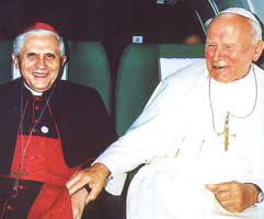 En 2002 après les attentats des Tours Jumelles, Jean-Paul II a répété sa convocation historique et cette fois il s’est fait accompagné d’une manière bien visible du cardinal Ratzinger. Je conserve la photo de tous deux, souriants et contents, qui se serrent la main tandis qu’ils partagent des sièges l’un à côté de l’autre dans le train qui les transportait de Rome à Assise. À cette occasion, Ratzinger a écrit une précieuse (ndt le mot en espagnol au sens propre correspond à la valeur, ou sens figuré à la beauté) méditation dans laquelle il disait : « Il ne s’agit pas d’affirmer une égalité entre les religions qui n’existe pas ; Assise a été l’expression d’un chemin, d’une recherche, d’un pèlerinage en faveur de la paix, que ce n’est ainsi que si elle va de paire avec la justice » (ndlr: je pense que c'est le texte de 30 giorni, dont j'ai parlé hier)
