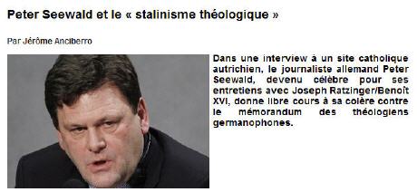 Peter Seewald n'a pas apprécié les attaques contre le Pape et l'Eglise charriées par les théologiens, et il le fait savoir sans prendre de gants, suscitant les critiques ironiques de Jérôme Anciberro, de TC (celui-là même qui avait traduit l'appel en français: La fronde des théologiens allemands ). Ce dernier va jusqu'à parler de "stalinisme idéologique!
