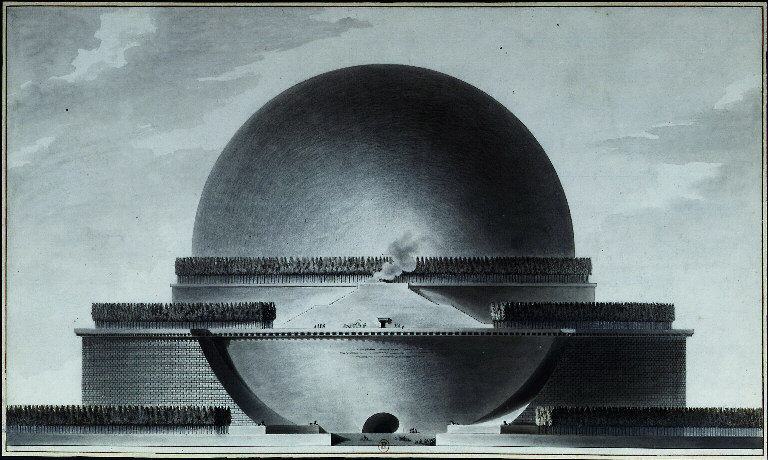 Cela commence avec Jacque-François Blondel (1705-1774) et la façade de l'église d'un couvent ressemblant à un monument funéraire, où c'est un obélisque qui soutient la croix, cela se poursuit avec son disciple le plus célèbre, Etienne-Louis Boullée (1728-1799) dont les cénotaphes sont la référence obligatoire pour tout architecte qui se prépare à construire de nouvelles églises et les dessins d'églises souterraines qu'il a conçuest (dont aucune consacrée aux Saints, à la Vierge Marie, au Christ, tous ont disparu) semblent être le modèle du Capitole à Washington ou de l'Opéra de Paris. Et puis, nous arrivons à Lequeu (1757-1826) qui achève la parabole, après les temples du silence et d'Isis des ou des sanctuaires persans, avec le temple du dieu inconnu.