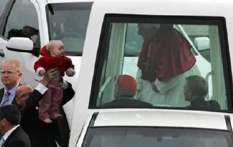 Benoît XVI embrasse le bébé Claire lors de son voyage à Sydney en 2008
