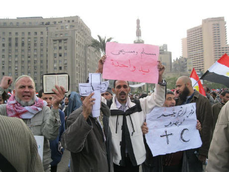 Plutôt que de faire un discours, il m'a semblé plus utile - pour une fois - de montrer des images de la Place de la Libération (Midân al-Tahrîr). Ce sont dix images montrant des musulmans et des chrétiens, avec leurs symboles religieux, main dans la main. Pour nous, Egyptiens , ce fait rappelle la révolution égyptienne de 1919 contre le Royaume-Uni, qui occupait l'Egypte et le Soudan, juste après l'armistice du 11 Novembre 1918 en l'Europe après la Première Guerre mondiale.