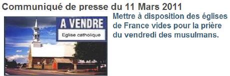 La proposition du Collectif du 11 mars, demandant à l'Eglise de France, la "mise à disposition des églises vides pour la prière du vendredi" des musulmans, est surprenante. Ces "églises vides" sont des lieux consacrés et il ne viendrait pas à l'idée à un chrétien de les utiliser pour autre chose que des cérémonies liturgiques, ou de la musique sacrée - une exception toujours possible. Il serait impensable de les utiliser pour célébrer un culte non-chrétien.