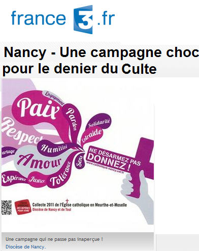 ou plutôt une pub scandaleuse, limite blasphématoire: celle du diocèse de Nancy. La recherche de "donateurs" excuse-t-elle de faire tout et n'importe quoi avec la Croix? (30/3/2011)