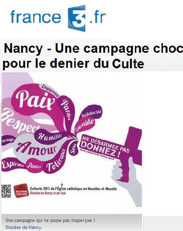 Après son mémorable "Jésus Crise, donnez, que diable" en 2010, le diocèse de Nancy et de Toul lance "Ne désarmez pas, donnez !" une nouvelle campagne pour inciter à verser le denier du culte.