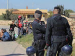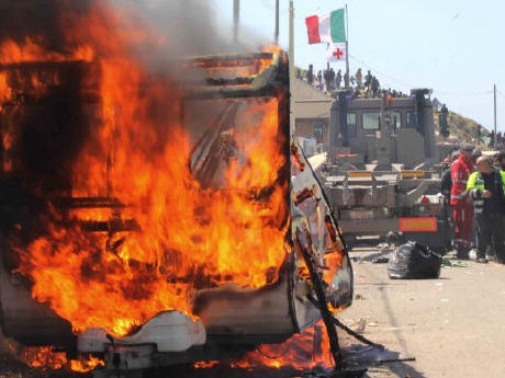 Des associations de défense des immigrés venues de toute l'italie (ligue anti-raciste, PDCI - parti communiste, PRC - refondation communiste, etc...) ont organisé un sit-in dans un village voisin pour assurer de leur solidarités, non pas les habitants, mais les nouveaux arrivés...