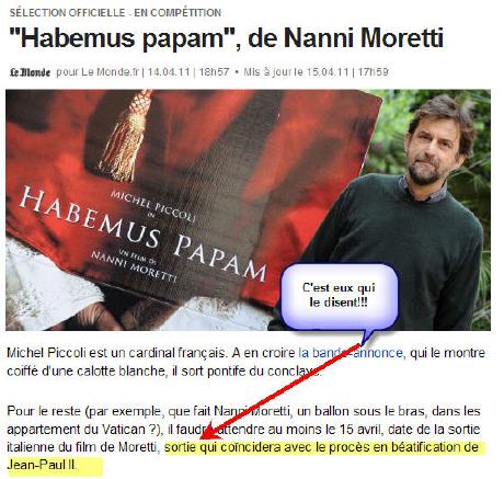 Nanni Moretti continue, quant à lui, de se tenir prudemment éloigné des querelles autour de l'Eglise. Il a toujours prétendu que son film ne se référait à aucune situation contemporaine et ne participait à aucun débat sur la foi. Et s'il a fait lire son scénario au cardinal Ravasi, considéré comme le ministre de la culture de la Curie, c'est seulement en vue d'obtenir une autorisation de tournage au Vatican, qui lui a été refusée.