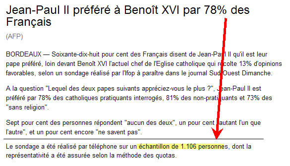 Avec de tels "correspondants" et la façon dont ils présentent l'information sur la papauté (qui est reprise, forcément, par l'ensemble de la presse), il n'est pas étonnant de lire des sondages aussi débiles que celui complaisamment présenté ici par la même AFP : oserions-nous faire observer aux désinformateurs professionnels que la grande diffférence entre Jean-Paul II et Benoît XVI... c'est que le premier est mort! (raison pour laquelle il est si aimé!)