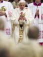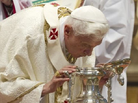 Lors de la messe chrismale, Benoît XVI explique la signification des huiles saintes: l'huile de l'onction des catéchumènes, celle pour l'onction des malades et le saint chrême pour les grands sacrements qui confèrent le Saint-Esprit: la Confirmation, l'ordination à la prêtrise et l'Ordination épiscopale.