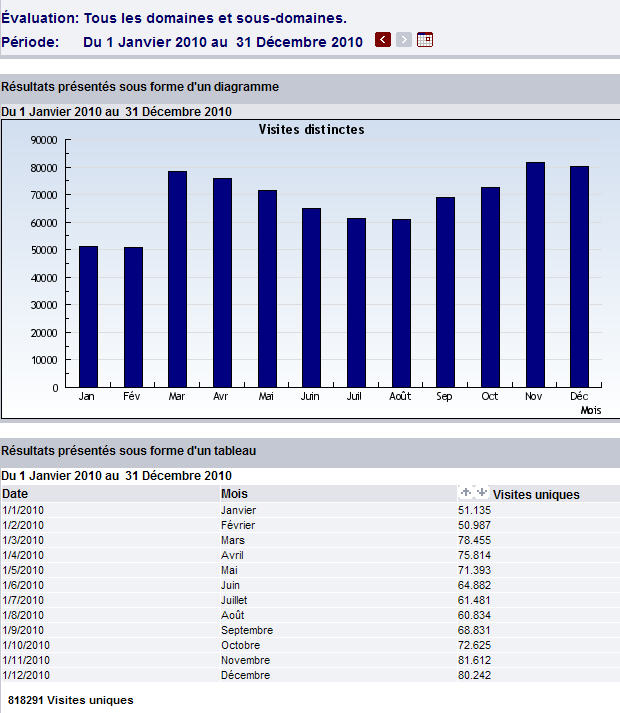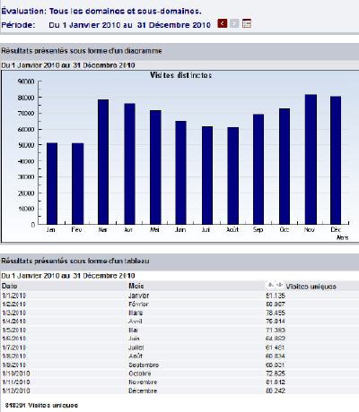 A mon grand plaisir, même si elle reste modeste (mais c'est la rançon de mon indépendance, de mon "anonymat", et peut-être le gage de ma tranquillité) elle est en progression constante, comme en témoigne ce diagramme de mon hébergeur, qui a comptabilisé 818.291 visites "uniques" du 1er janvier au 31 décembre 2010. Actuellement, benoit-et-moi reçoit une moyenne de 18.000 "visites uniques" par semaine. Pour mémoire, durant les premiers mois de son existence, mon site ne dépassait pas 5 visites par jour!