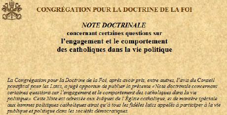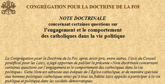 Neuf ans ont passé depuis la publication de la "Note doctrinale sur certaines questions sur la participation des catholiques dans la vie politique" (1) , approuvé par Jean-Paul II et signée par le Cardinal Joseph Ratzinger , un document où il est affirmé: «Si le chrétien est tenu "d'admettre la multiplicité et la diversité des options temporelles", il est aussi appelé à se défier d'une conception du pluralisme en terme de relativisme moral, nuisible à la vie démocratique elle-même, qui a besoin de fondements solides et réels, autrement dit de principes éthiques qui, par leur nature et leur rôle en tant que fondement de la vie sociale ne sont pas 'négociables'".