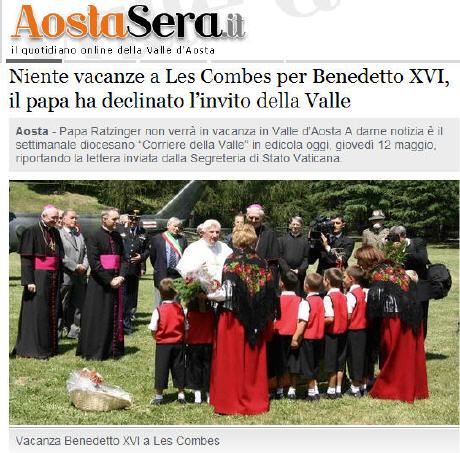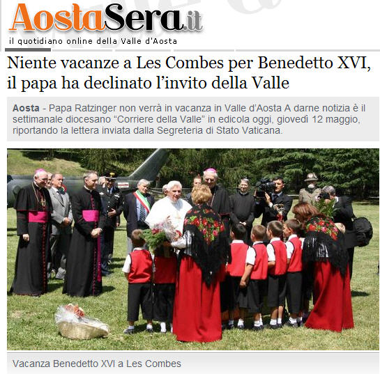 "Benoît XVI a décliné l'offre faite par l'évêque d'Aoste, Mgr Anfossi, de passer ses vacances dans le Val d'Aoste, comme il l'a déjà fait à deux reprises. "