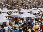 La célébration de l'Eucharistie se déroule de façon ordonnée. Suggestif, aussi, le moment de la communion: les célébrants sont sous autant de parasols blancs, qui rejoignent les différente parties du parc. Des attentions spéciales sont réservées aux céliens (membres de CL, ndt).